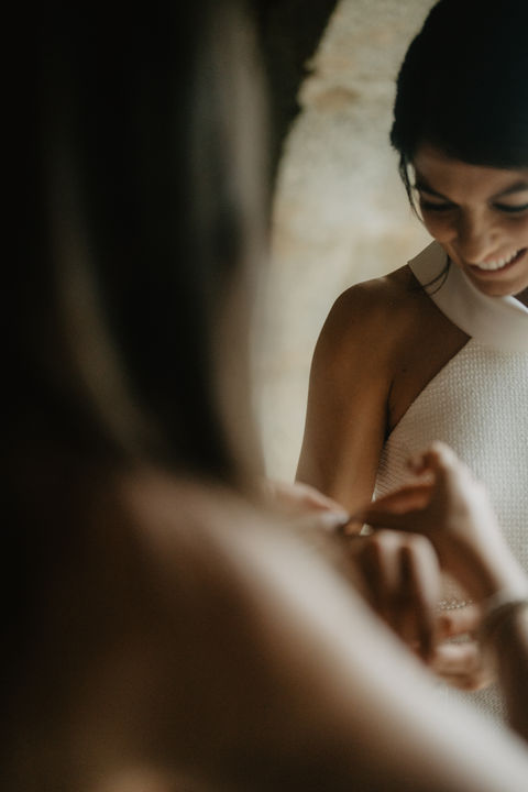 Las horas previas a la ceremonia son, sin duda, uno de los momentos más especiales de ese día. Es ese instante en que el futuro novio se abrocha la camisa con un poco de nervios, y la novia se pone su vestido soñado. ¡Qué emoción! Son momentos llenos de alegría, abrazos, lágrimas y la oportunidad de compartir sentimientos tan profundos. Por eso, es importante que también penséis en el entorno. Me encanta capturar esos momentos mientras os maquillan, así que pensad bien en lo que llevaréis. Para ellos, una ropa casual es ideal, y para ellas, una bata del color que más les favorezca siempre queda genial. Lo mejor para ese día sería un lugar abierto y con mucha luz natural, como una habitación de hotel con grandes ventanas o un Airbnb acogedor. A veces, la misma finca de la ceremonia tiene espacios preciosos para esos momentos previos. Y no olvidéis que es importante que vuestros invitados, familiares y damas de honor también se sientan cómodos. ¡Todo cuenta para que ese día sea perfecto!